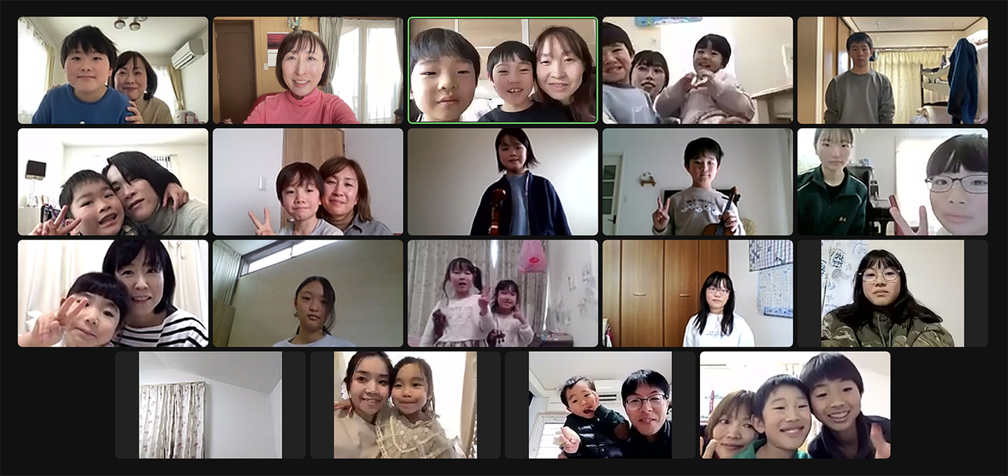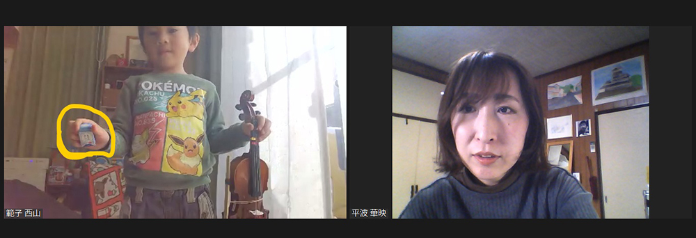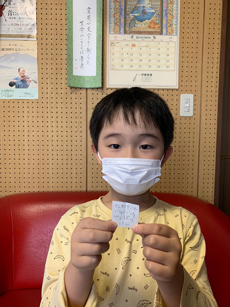 みんなと一緒にヴァイオリンを弾いたり、おみくじ(景品の当たるくじのこと)を引いたり、写真を撮ってもらったり、みんなのお家が映ったり、1人で弾くのは緊張したけれど、とても楽しかったです。(晋太郎 5歳・年長)