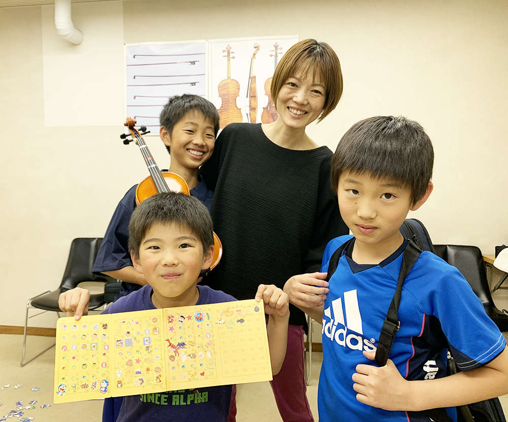 個人レッスンでは、子どもの演奏を必ず褒めてくださり、直す箇所はわかり易く的確に指導してくださいます。グループレッスンも、楽しい交流の場としてのレッスンだけではなく、立ち姿・弓の持ち方等々初歩から妥協なく確認し教えてくださいます。上級生の演奏を聴いたり、レッスン後のお茶会でお友だちとお話をしたりと、ヴァイオリンを通して目線が広がり、とても良い刺激を受けているように思います。毎日十分なお稽古をすることは難しく悩ましいのですが、それでも、楽しみながら一生続けていってほしいと願っております。≪東古(小5)の母≫