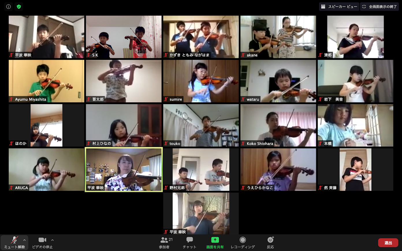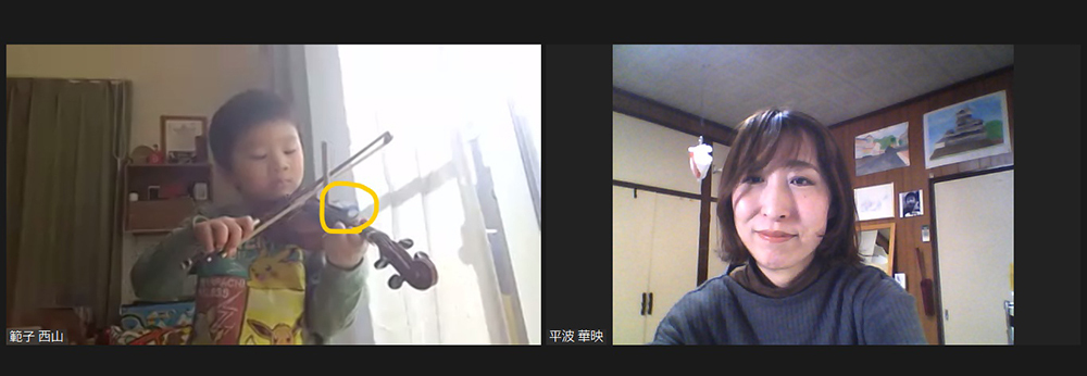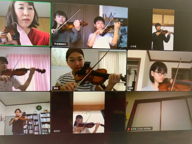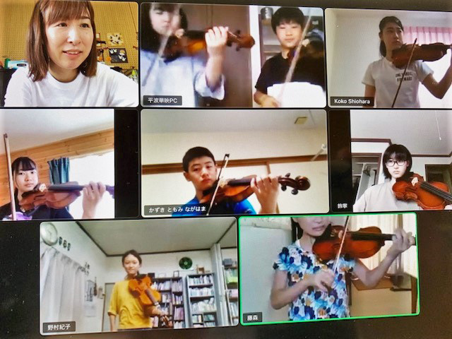 とても楽しかったです。オンラインは姿勢や足は見えないけど、その分、自分で気をつけて良くしよう、と思いました。手や弓については先生がよく見ていてしっかり注意してくれたので良かったです。合奏はできなかったけど、一人ひとりの音を聴くことができたのも良かったです。最後のビンゴ大会もとてもワクワクして楽しかったです。何が当たるかな?早く本当のみんなの音を聴きたいです。その日が楽しみです。(志帆 小4)