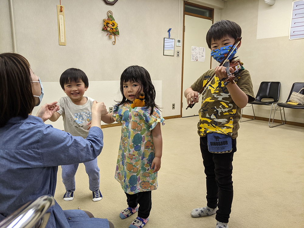 またお兄さんお姉さんが、小さな子をみてくれていて、心温まるクラスに入会することができ、とても嬉しく思いました。最後のコンサートでは、「こぎつね」を楽しそうに弾いている姿をみて、これからの成長がますます楽しみになりました。(渉 母)