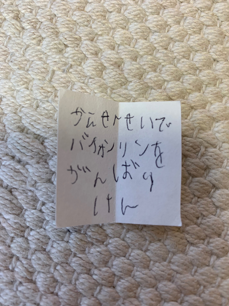 本日はありがとうございました☺️壁に弓がぶつかったー😱とか、いろいろハプニングもありましたが、(大きくなった👀‼️ということですね)最後までなんとか弾いていました。これから弾きたい曲も、なんだかたくさん書き出していて、すごいね~🎵とやる気を感じています✨(すみれ:小3 母)