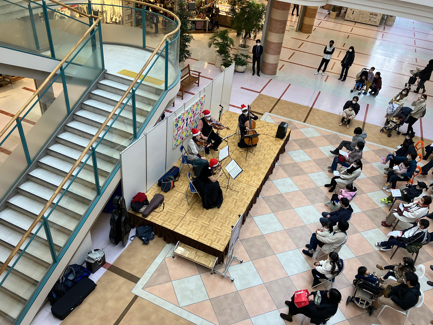撮影会の行列が落ち着いた後は、指導者3人によるミニコンサートを。讃美歌や冬やクリスマスにちなんだ曲を演奏しました。ステージ前の客席だけでなく、2階や3階のテラス席から耳を傾け、お聴きいただいている姿も見えて、いろいろな方にお聴きいただけたことを実感できました。華やかなクリスマスシーズンを彩る時間として、お客様の心に残ってくれたら嬉しいです。