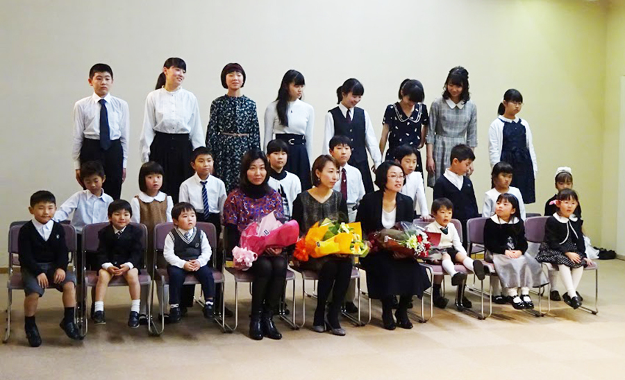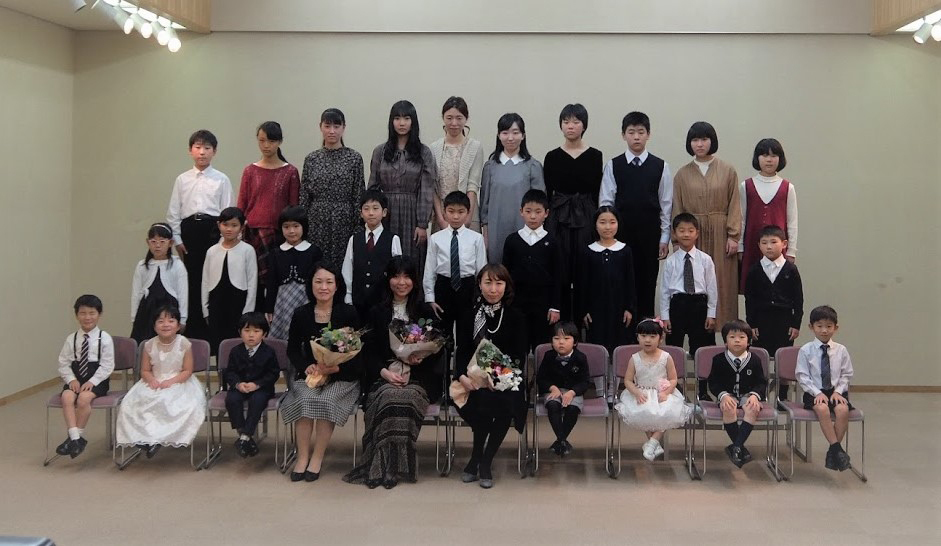 平成28年度卒業生の証書授与式で卒業生のお祝いをし、続いて、生徒一人ずつの独奏会を行ないました。秋の発表会とは違い、独奏会は復習曲の中から、私と相談で曲を決めて、この日に向けて各自おけいこに励みました。最後にみんなで記念撮影をしました。