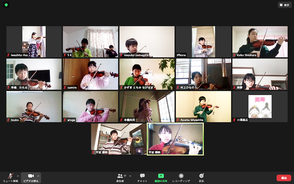 それぞれのご自宅から、保護者の皆様大勢の方がご参加くださいました。鈴木鎮一先生の著書、「愛に生きる」の読み合わせ、そこから平波自身が感じることをお話しいたしました。そして、皆様からも一言ずつ、日頃感じていることなどお話しいただき、最後はビンゴ大会! 第2回となる今回も時間が足りないくらいの楽しいひとときとなりました。皆様との時間は日頃の疲れも吹き飛ぶくらい、大切な、幸せな時間です。第3回(いつ?)今から楽しみです!
