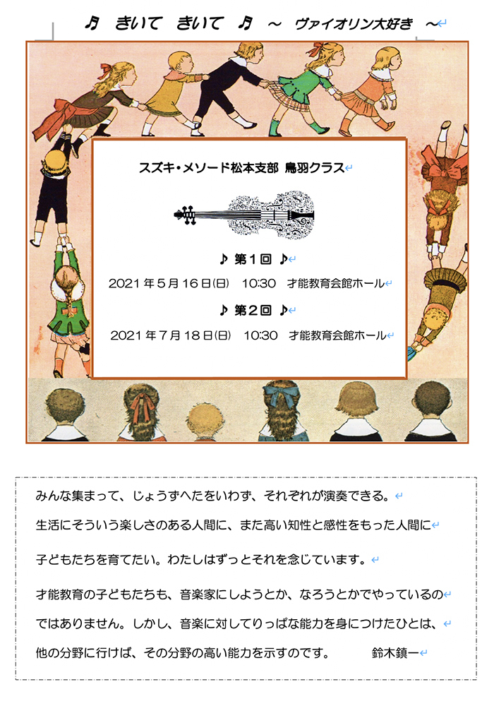 ♫東京から松本に引っ越してきました。港区のマンションでは裏がNHK交響楽団でしたが、音楽にはまったくご縁がありませんでした。松本に引っ越し、子どもが「バレエじゃなくて、ピアノじゃなくて、ヴァイオリンをやりたい!」と言うので、スズキ・メソードの門を叩きました。ヴァイオリンに涙のあとが残る日もありますが、これからも鳥羽クラスの仲間とともに、前に向かって一歩ずつ進んで行くことを楽しみにしています。(母)